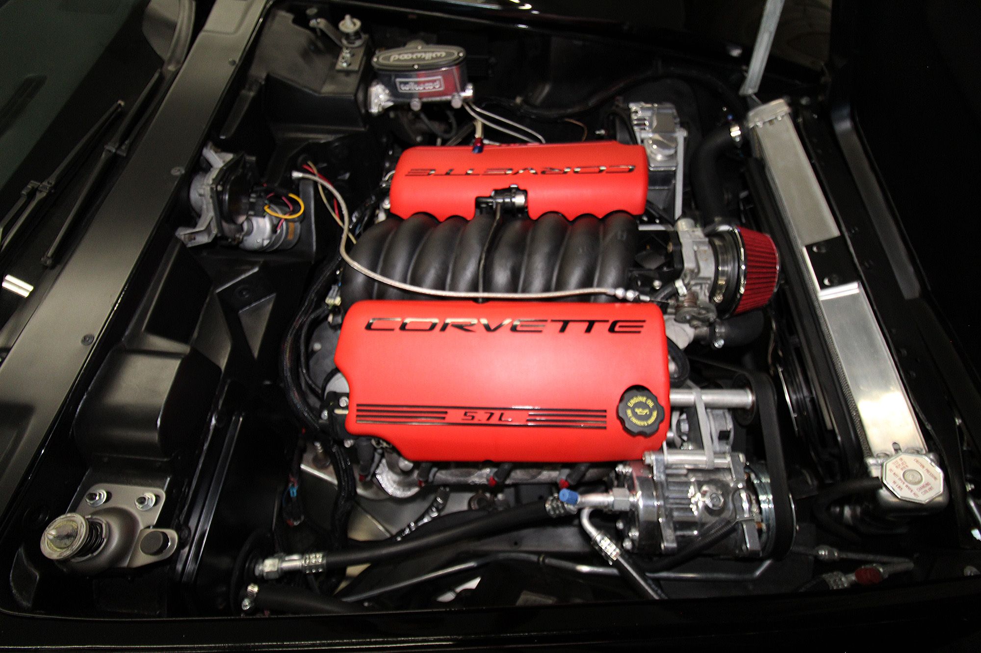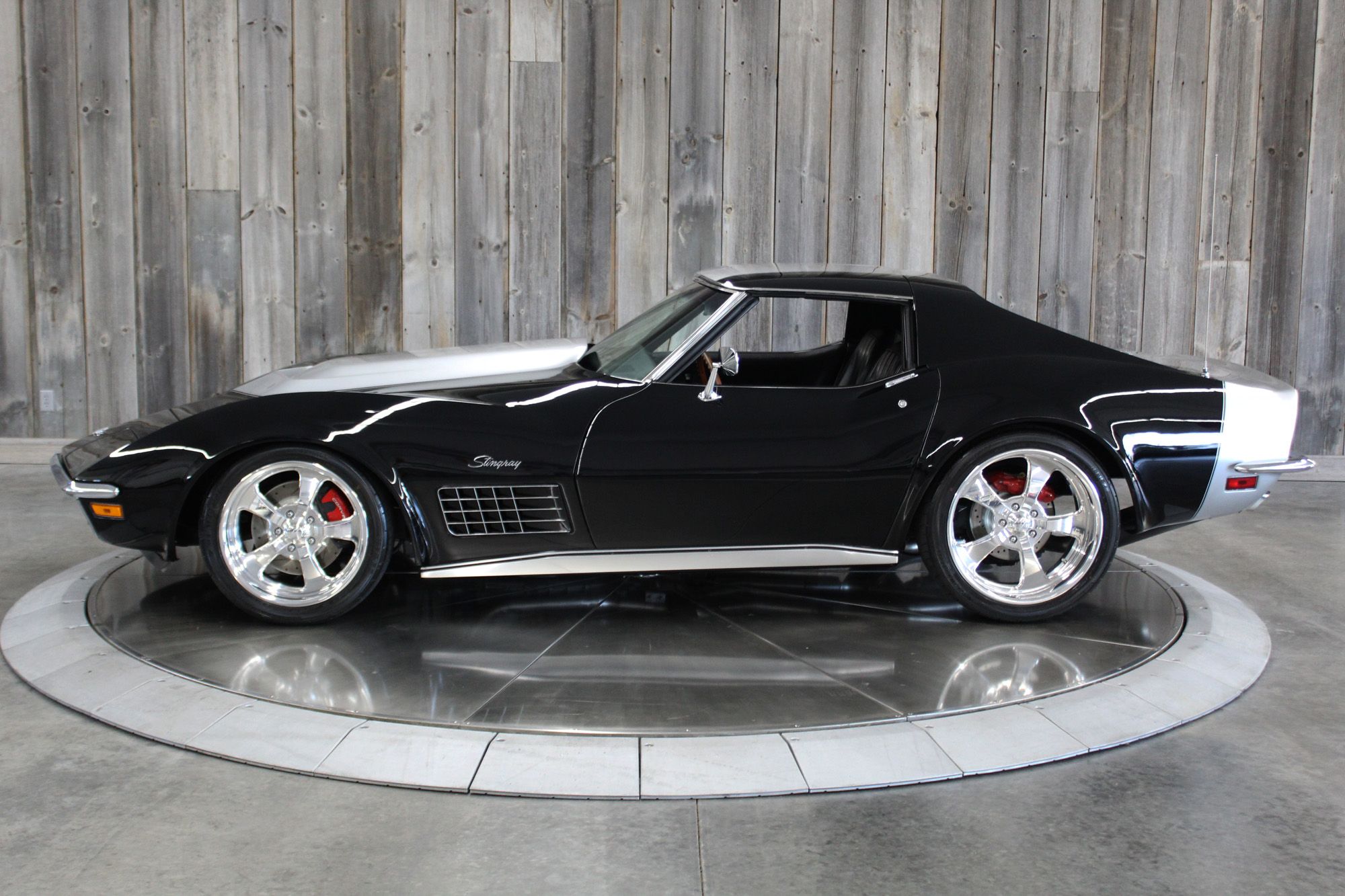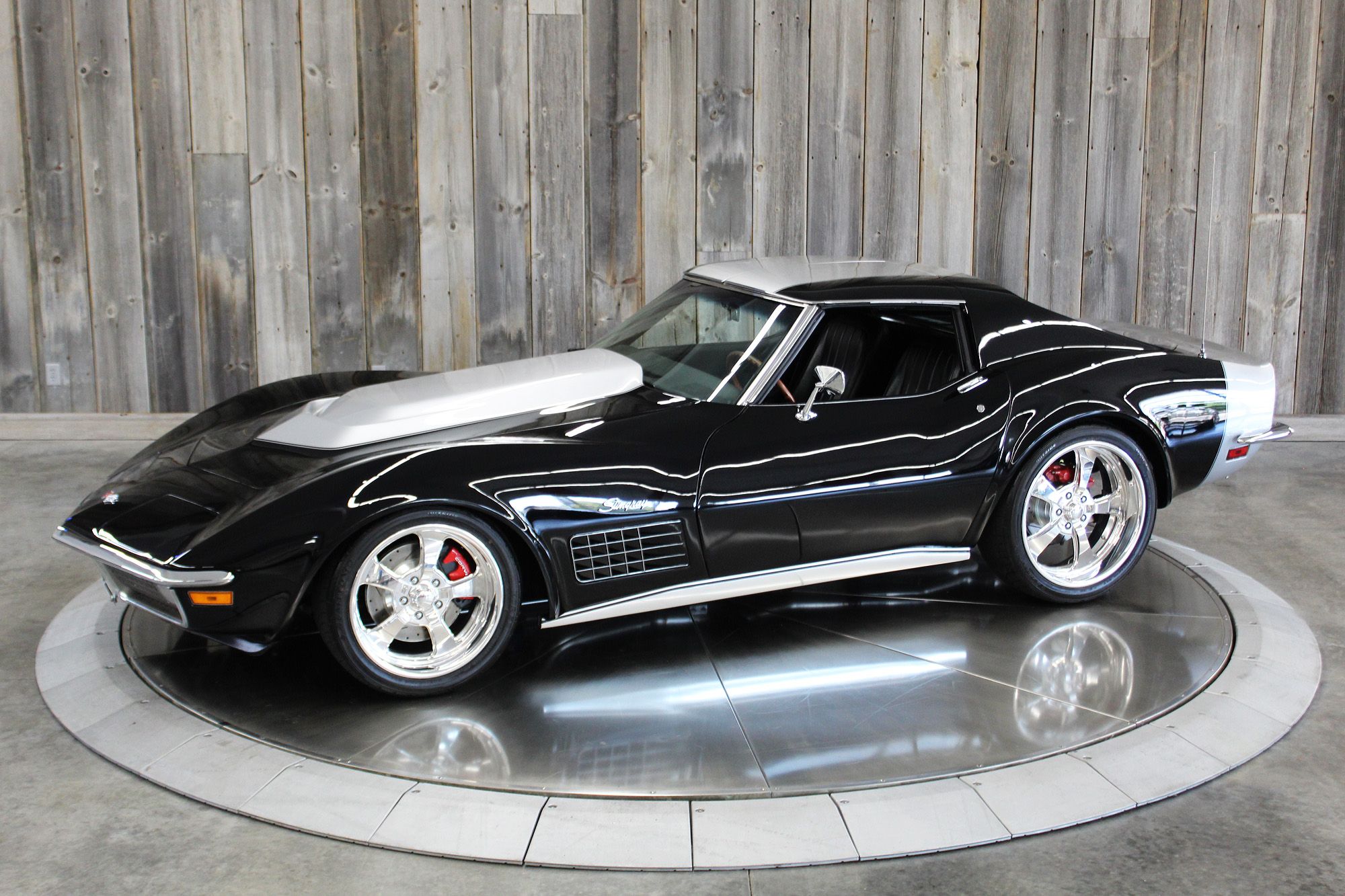Frame-off Restored. 5.7L LS1 V-8 engine, LS1 heads, port and polished, Thunder Racing 224/224–112 camshaft. Tremec T-56 6-speed manual transmission, Pro 5.0 6spd shifter with hydraulic clutch. Axalta Cromax Black Paint, and Demon Axalta Cromax Pro Super Silver. Baldwin motion paint scheme. Aftermarket polished Billet specialties SLX series wheels, 18-inch in front and 20-inch wheels in back. Billet gas-fill inlet cover. 4-wheel disc brakes with Red calipers and drilled and slotted rotors, Wilwood master cylinder, Borgeson power steering, Comp Springs. L88 Corvette hood, Vintage Air. Electric pop-up headlight conversion. All new black vinyl upholstery. Kenwood CD stereo with Infinity speakers and 6 x 9 Infinity speakers in separate enclosures in the rear. Removable rear window. Tilt steering column with natural wood, three-spoke steering wheel. Embossed Corvette racing flag floor mats. New black nylon lap belts and original retractable shoulder belts behind the seats. All the weather strip, carpet, handles, etc. are new or restored. The odometer reads 43,926 miles, its estimated current miles are under 7,000 since restoration. All new chrome bumpers, new/restored stainless, and new emblems as well. Build Documents Included. This is a seriously nice RestoMod that will impress the most decerning collector or avid performance driver.